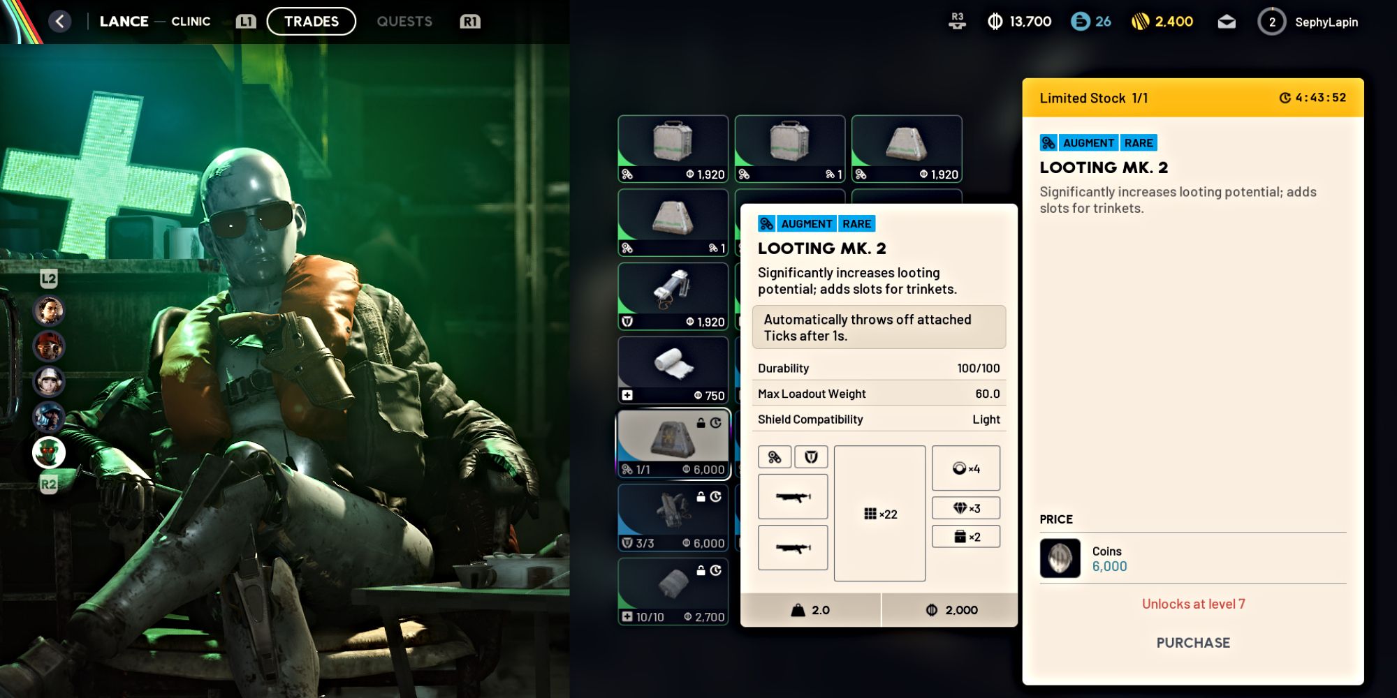 Активация Безопасного Кармана происходит немного иначе, но вам всё равно потребуется совершить покупку. Перейдите к Lance, торговцу в клинике в Speranza. Он продаёт различные Улучшения, и вам нужно Looting MK. 2 Augment.