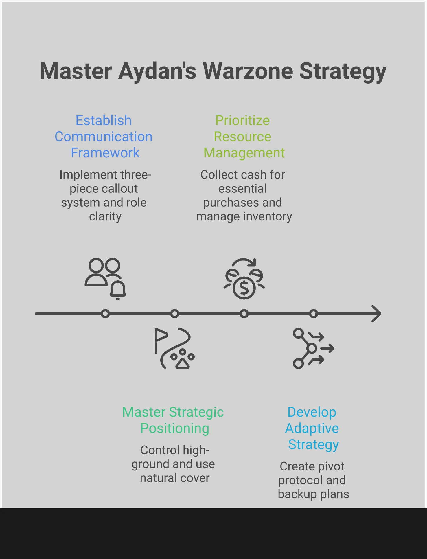 Давайте начнем воплощать эти идеи в жизнь. Стать лучше в Warzone – это не мгновенное решение – это постоянное выстраивание хороших привычек с каждой игрой, в которую вы играете. Рассматривайте это как ваш личный план улучшения. Начните с работы над своей коммуникацией. Не просто сообщайте о позициях врагов; дайте своей команде знать, когда вы пополняете броню или делитесь деньгами на оборудование. Эти небольшие детали делают команду по-настоящему великой и помогают вам избежать ошибок, которые часто сдерживают игроков.