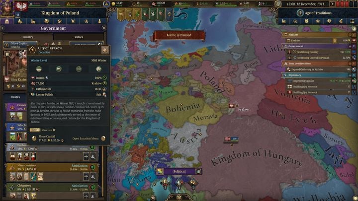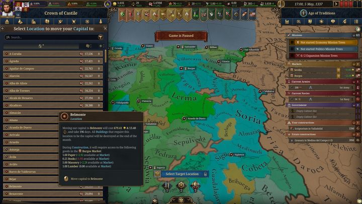На протяжении всей истории многие государства переносили свои столицы, обычно чтобы лучше отразить расширяющуюся территорию и улучшить стратегическое положение. Эта концепция также применима в EU5. Поддержание ваших провинций близко к столице жизненно важно для поддержания сильного контроля над вашей страной. Однако, если ваша столица плохо расположена, добиться этого может быть сложно. Хотя перенос столицы может быть хорошим решением, это сопряжено со значительными затратами.