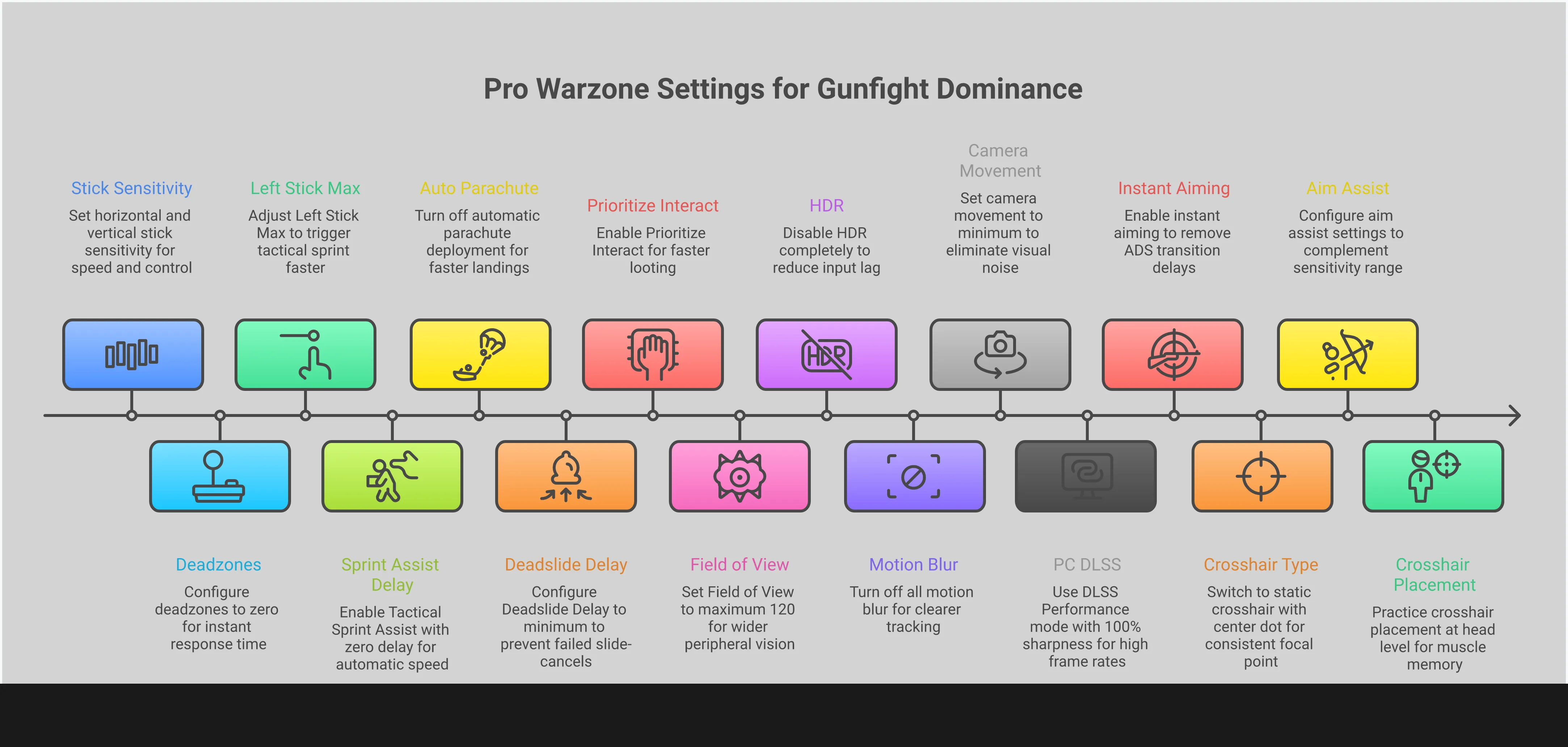 • Оптимизируйте Ваши Визуальные Эффекты и Движение для Лучшей Осведомленности: Установите Угол Обзора (FOV) на 120, чтобы видеть больше окружающего пространства, и включите автоматический тактический спринт для более плавного и отзывчивого движения. Эти изменения помогут вам быстрее замечать врагов и эффективнее перемещаться по карте.