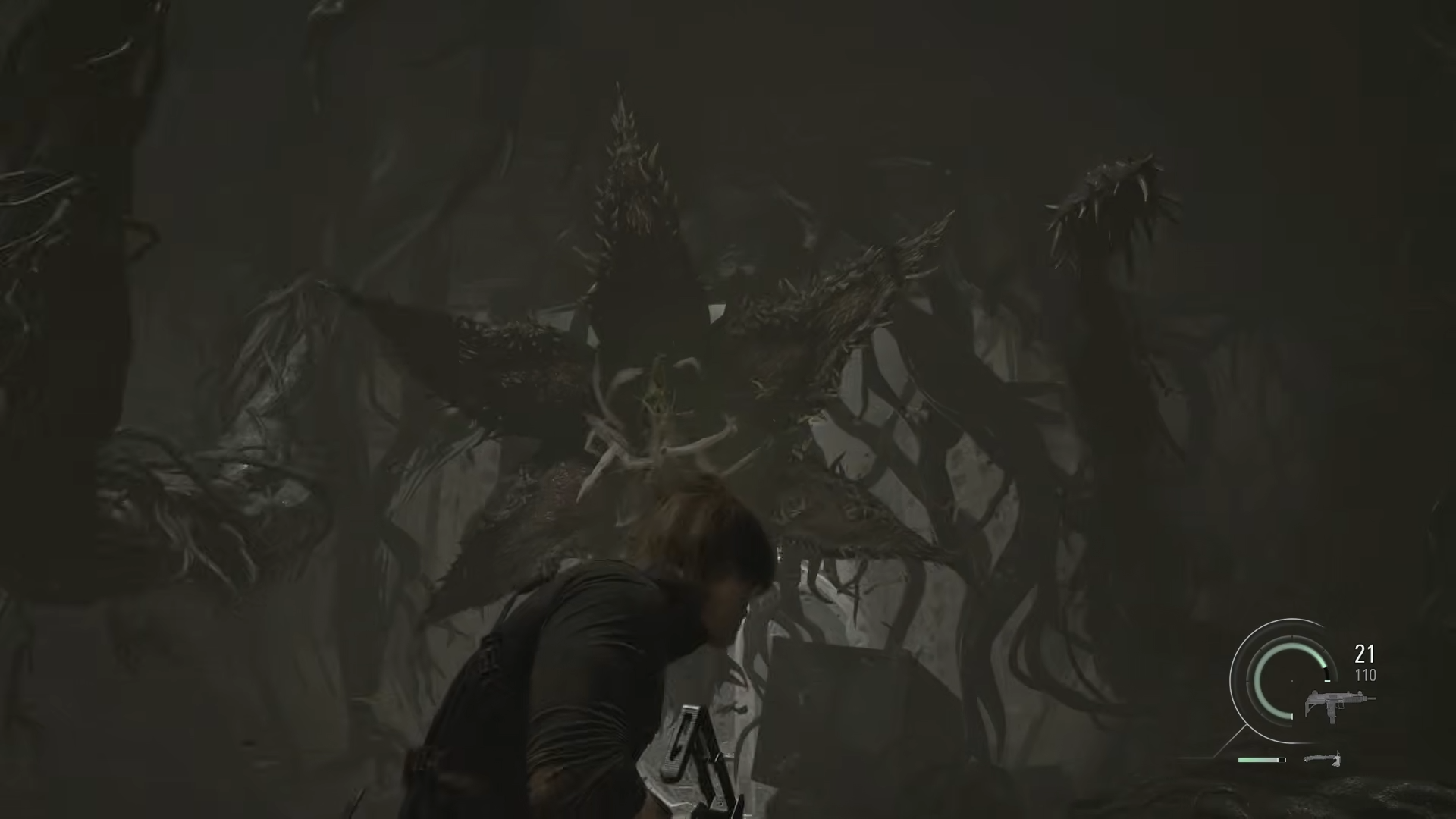 Бой Леона со второй частью существа происходит в очень узком, извилистом наборе коридоров. Там слишком мало места, чтобы просто бегать вокруг него, поэтому вам постоянно приходится отступать и обходить его, стреляя, и добавлять ближние атаки, когда это возможно.