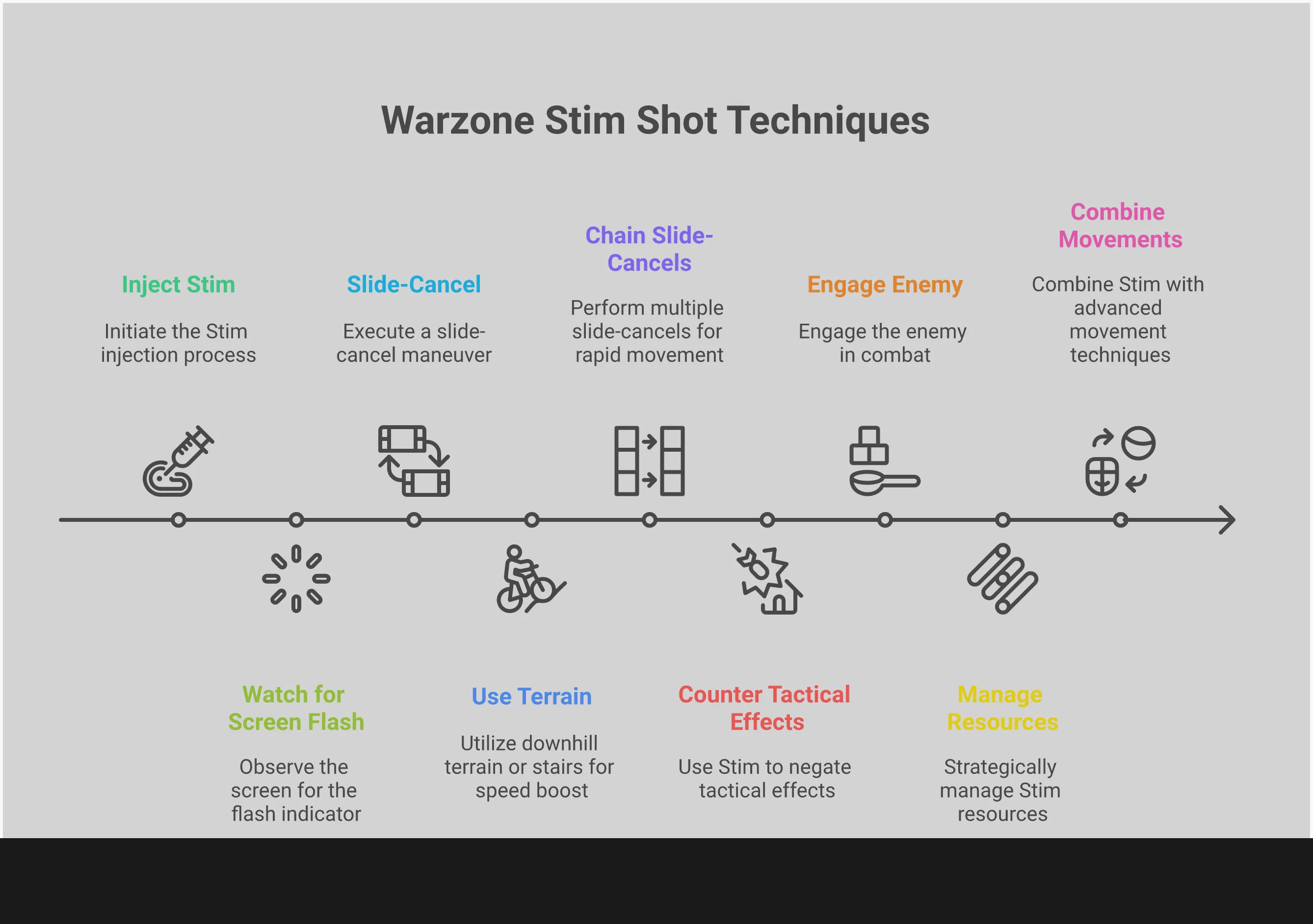 - Отточи Своё Чувство Времени для Максимальной Скорости: Чтобы получить полное увеличение скорости от Stim, необходимо дождаться завершения анимации. Активируй Stim, следи за вспышкой на экране, а затем немедленно скользи, чтобы быстрее преодолевать расстояние.