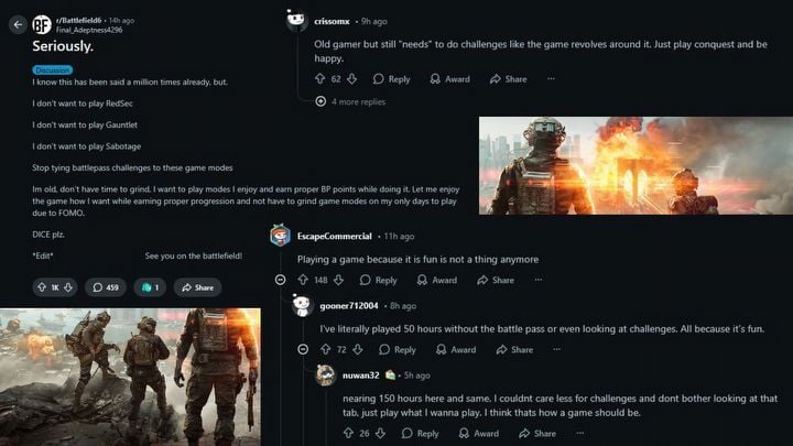 Пользователь на сабреддите Battlefield, Final_Adeptness4296, выразил разочарование системой прогрессии в Battlefield 6. Он объяснил, что боевой пропуск требует играть в режимы, такие как RedSec, Gauntlet и Sabotage, которые ему и другим не нравятся. Они просто хотят иметь возможность играть в те части игры, которые им нравятся, и всё равно продвигаться, не будучи вынужденными перемалывать нежелательные режимы. Пользователь отметил, что с возрастом у людей становится меньше времени на хобби, и особенно обескураживает, когда игры кажутся утомительными или заставляют игроков заниматься деятельностью, которая им не нравится. По сути, они хотят свободы наслаждаться игрой по-своему, при этом всё ещё имея возможность продвигаться.